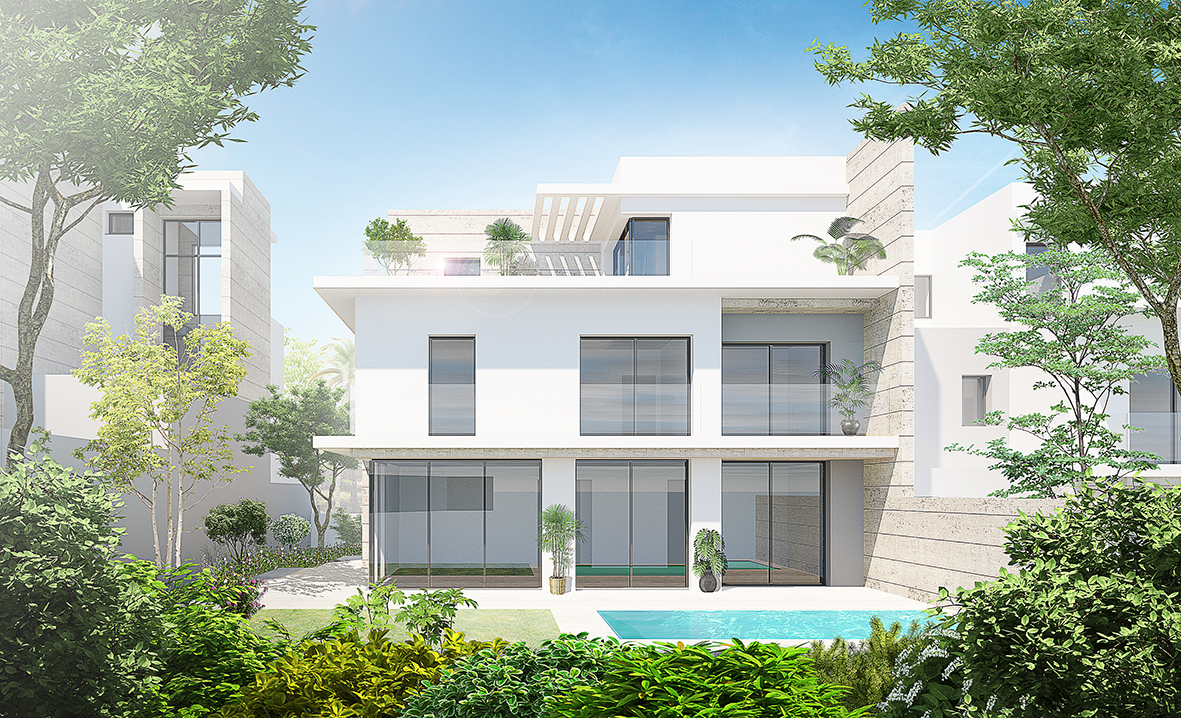 Les villas profitent chacune d’un petit jardin paysagé mais surtout de larges espaces ouverts de terrasses à tous les niveaux . Un soin particulier a été apporté aux matériaux et aux formes franches et épurées. Les murs de séparations et les sols extérieurs sont traités en travertins. Les escaliers en bois massifs dans la continuité des parquets en chêne sont positionnés dans des espaces largement vitrés. Les garde-corps en verre permettent la diffusion de la lumière.